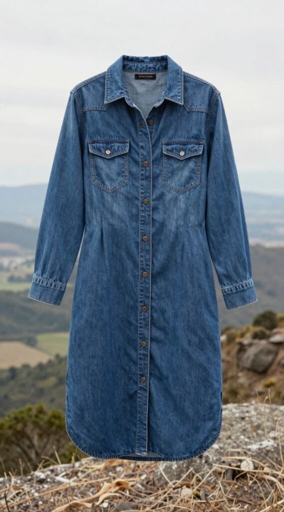 A lightweight denim shirt dress is a fantastic option for its versatility and durability. It’s casual yet stylish and offers good coverage from the sun.