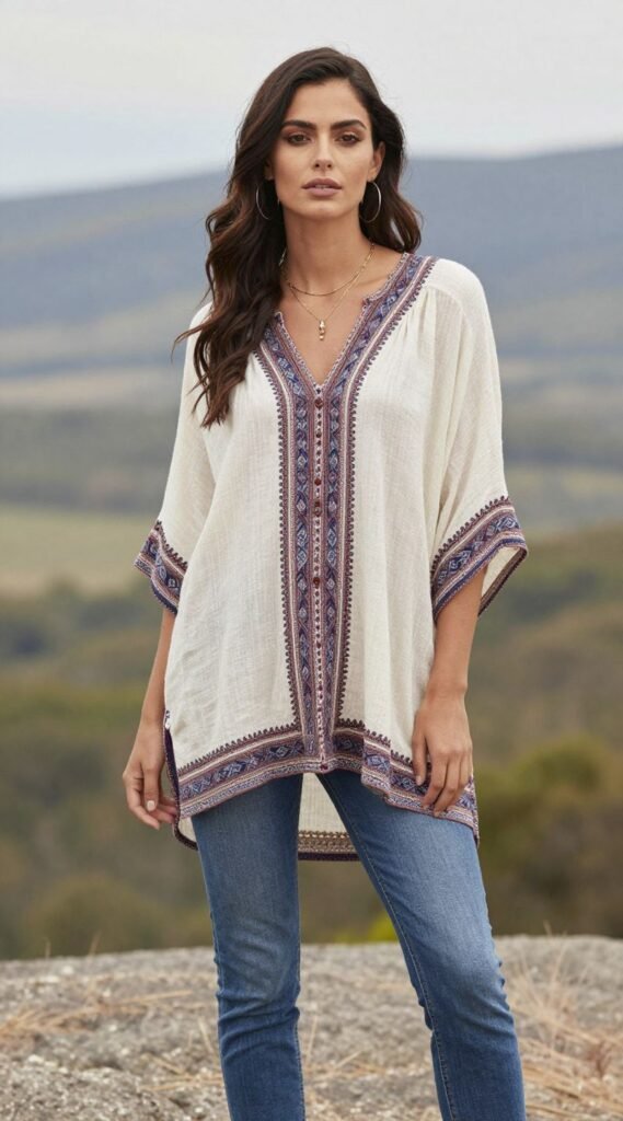For a touch of bohemian flair, rock a embroidered tunic with your favorite light-wash jeans. It’s a classic combo that offers both style and practicality, especially if you prefer more leg coverage.
