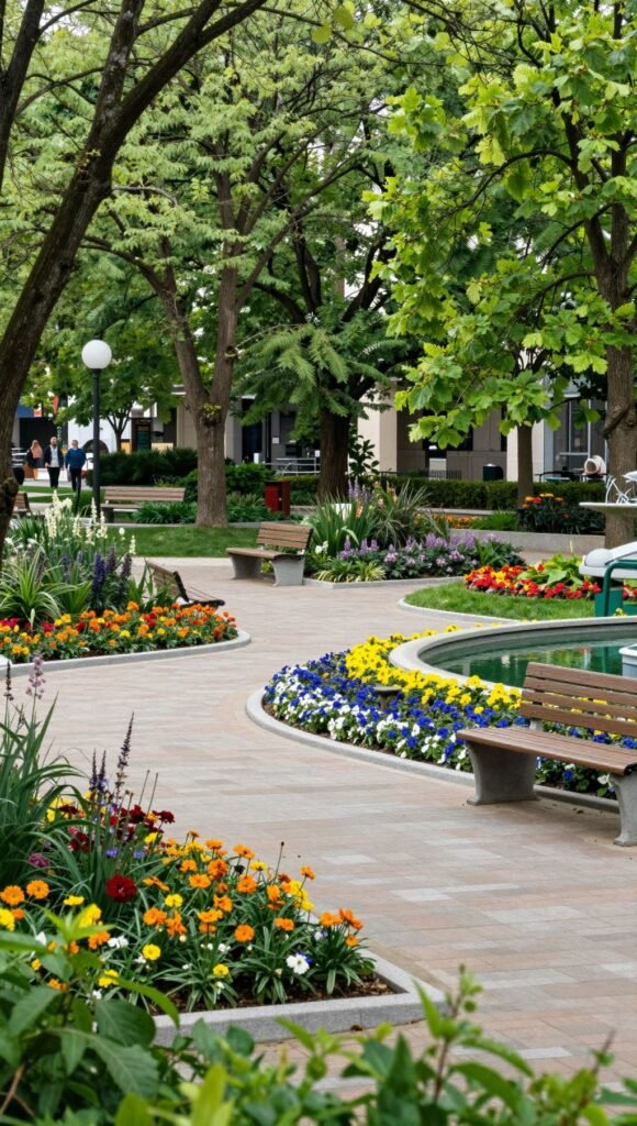 Plant a variety of trees, arrange colorful flowerbeds, and dot the area with benches and perhaps a small, decorative pond. Mix different biomes’ trees and flowers for a more diverse and natural look. Don’t be afraid to experiment with height and color!