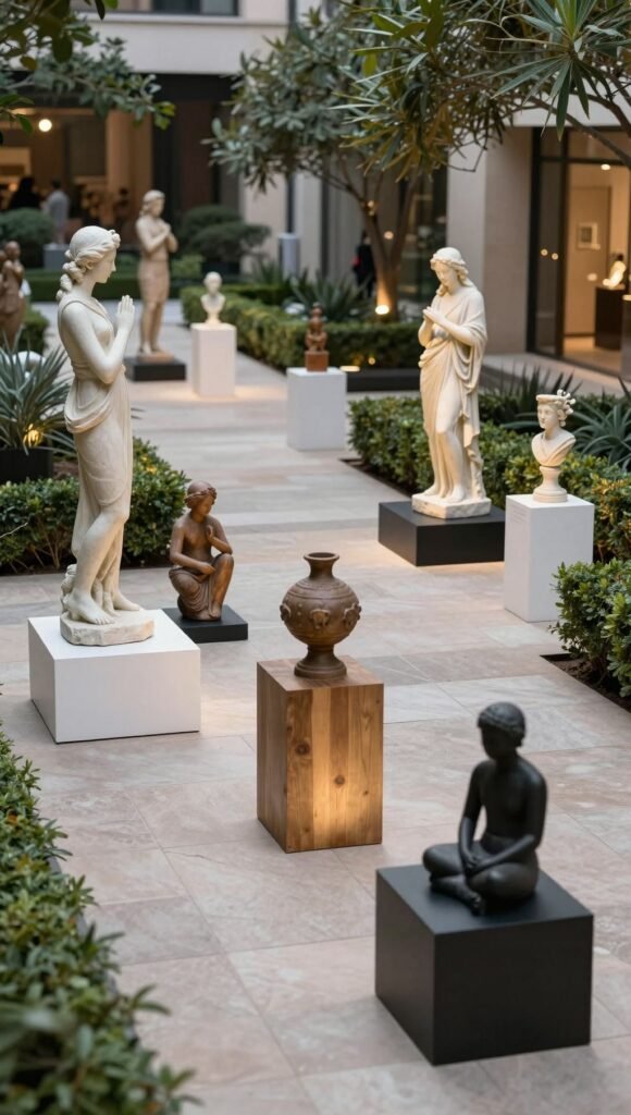 Arrange unique statues, crafted items, and decorative pedestals along well-lit paths. Frame your sculptures with lighting and low hedges to make them truly pop. Every piece tells a story, so let it shine bright.
