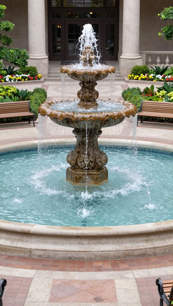 Place a magnificent fountain as the centerpiece, then surround it with elegant benches, lush flowerbeds, and perhaps some smaller complementary water features. Consider using multiple smaller fountains or diverse water elements around the main one for an even grander, more dynamic effect.